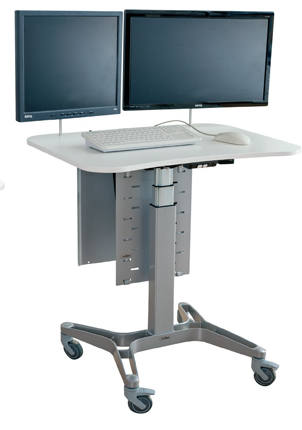 Electric adjustable computer cart on wheels for two monitors
