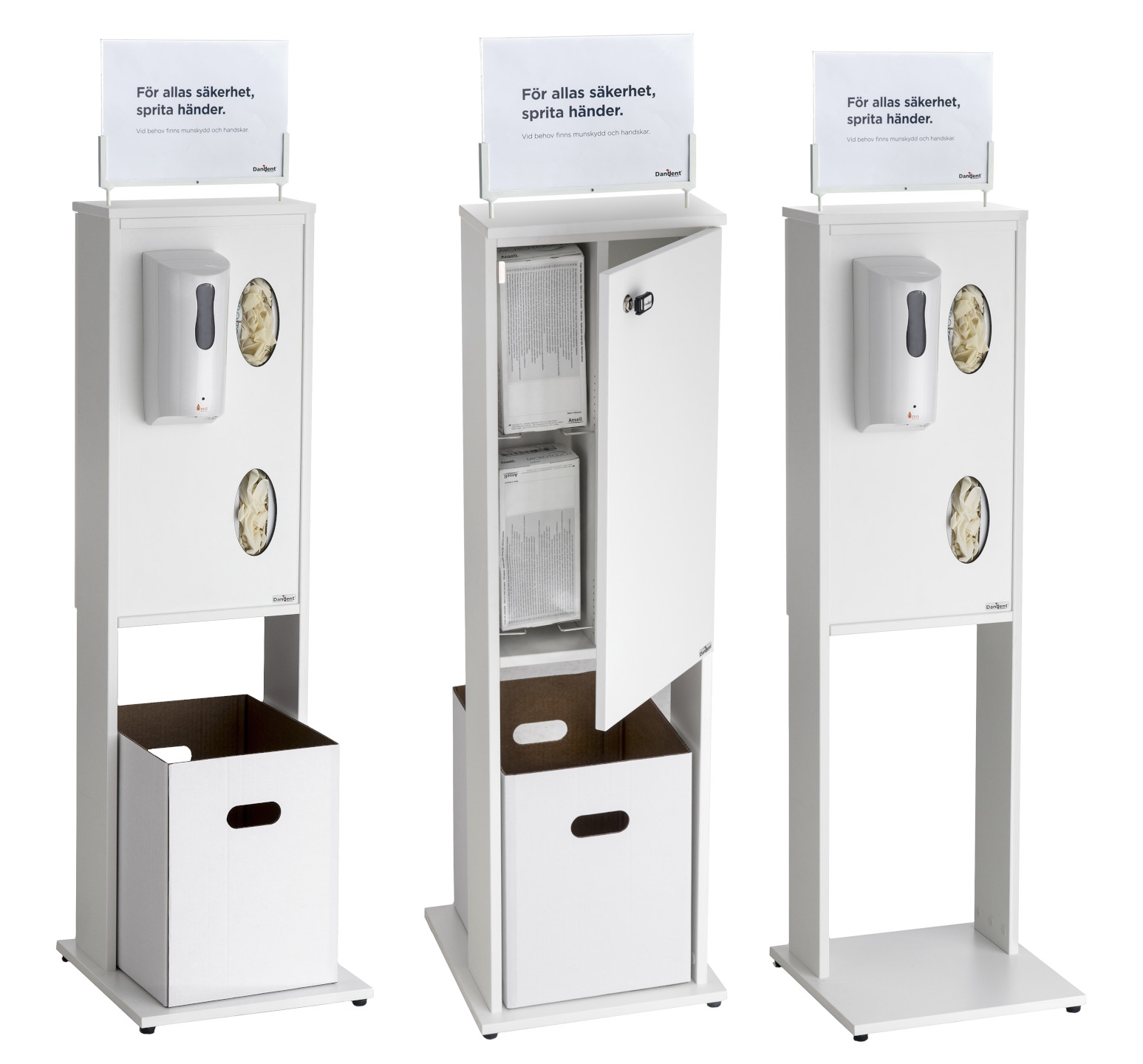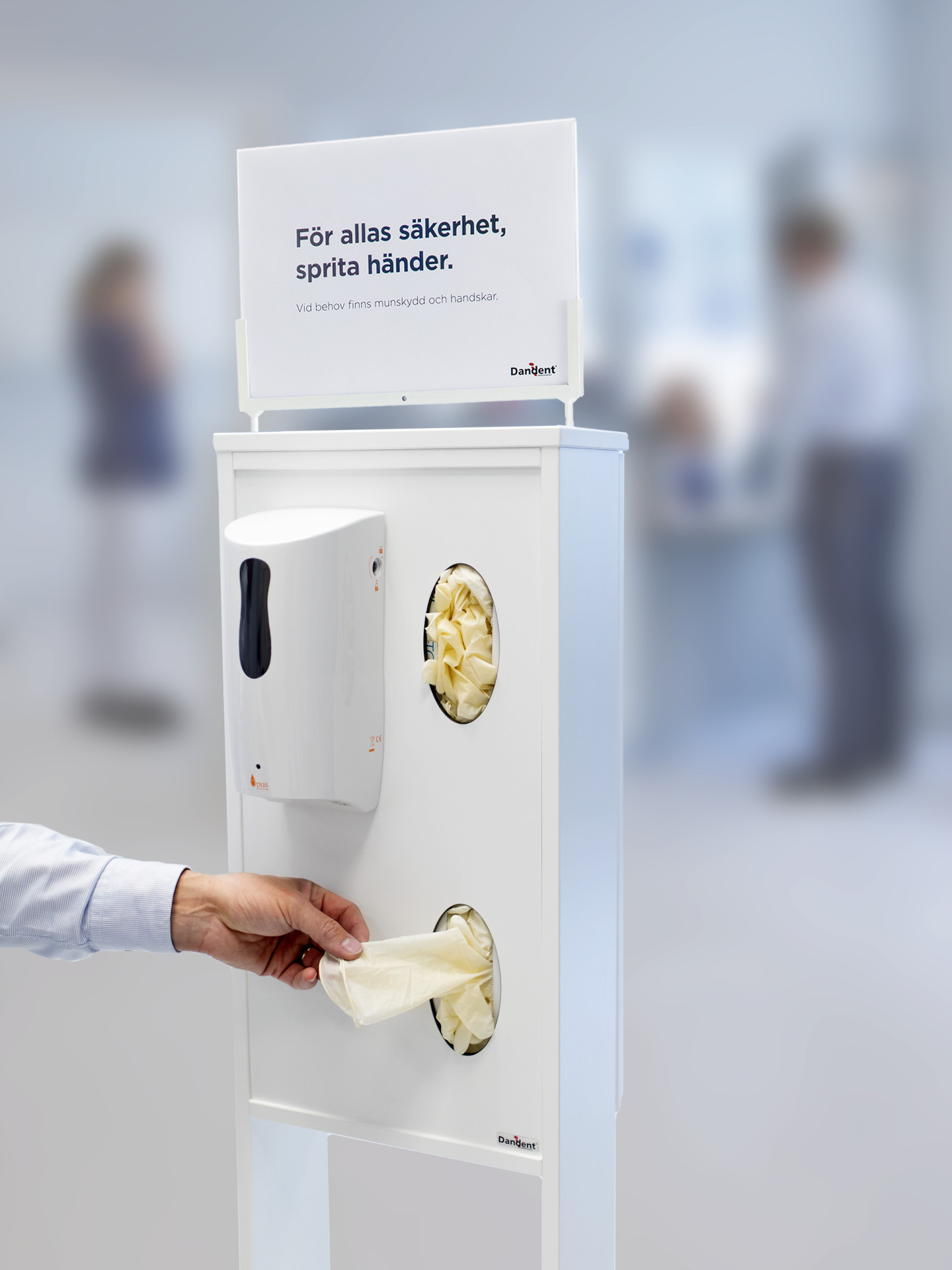 Kompakt och smidig hygienstation, enkel att ställa i entré eller reception. Skyddar dina besökare och personal och erbjuder användning av handsprit, handskar eller munskydd.