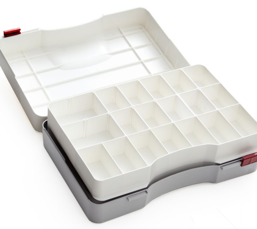 Lådan har handtag som går att dra upp och den är stapelbar. Avdelare ingår i lådan.