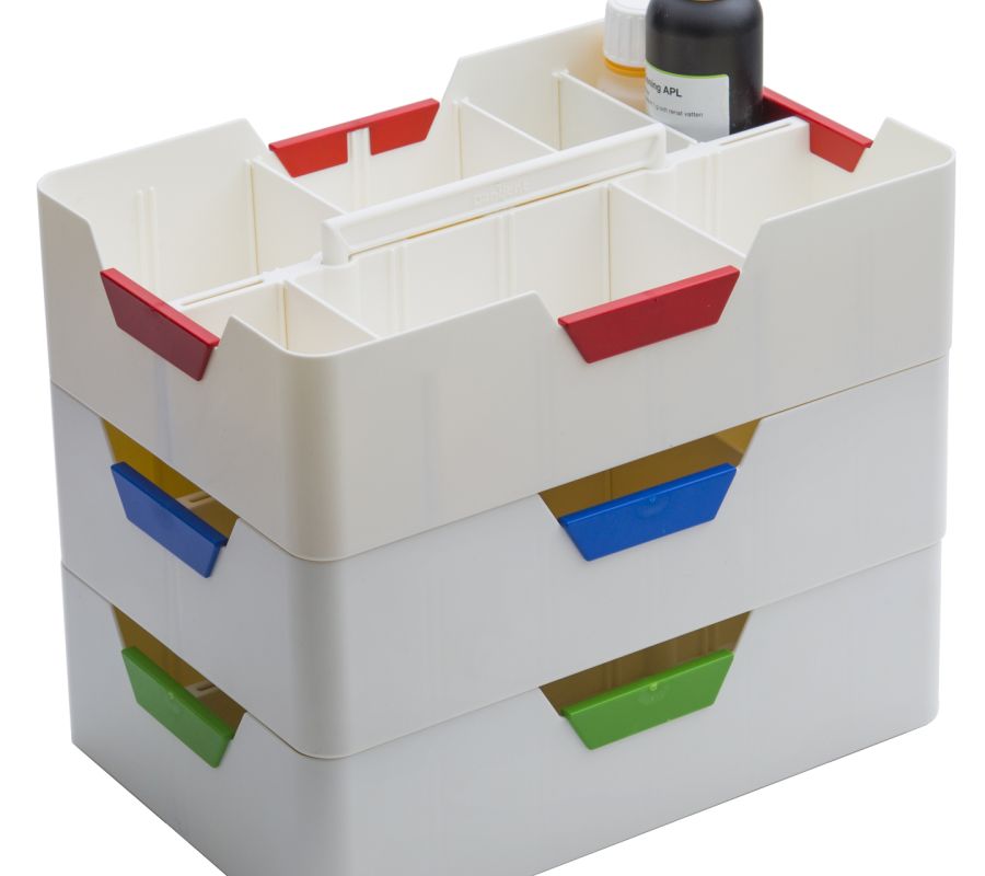 Vår senast framtagna förvaringslåda kan flyttas mellan behandlingsrum och plockförråd.